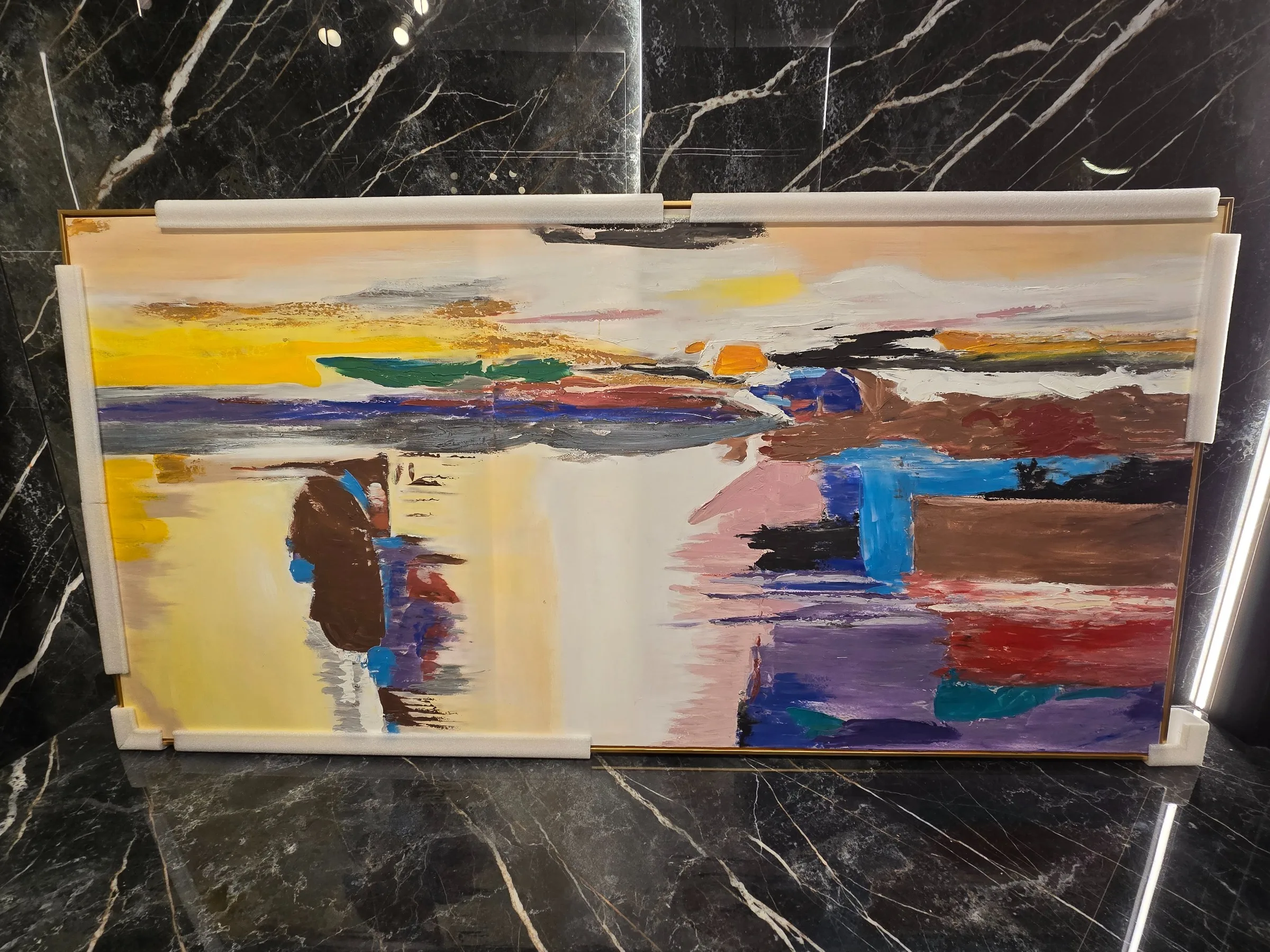 Oferujemy Państwu wyjątkowy, ręcznie malowany obraz o imponujących wymiarach 200 cm x 100 cm, który wprowadzi nowoczesny styl do każdego wnętrza. Jego abstrakcyjny charakter oraz intensywna kolorystyka przyciągają wzrok, sprawiając, że staje się on efektownym akcentem w salonie czy sypialni. Malowany na wysokiej jakości płótnie, obraz ten łączy trwałość z estetyką, co zapewnia jego długowieczność i zachowanie pierwotnych walorów przez długie lata. Dodatkowo, złota rama, w której został umieszczony, podkreśla elegancję dzieła, nadając mu luksusowego wyrazu. Wybierając ten obraz, inwestują Państwo w unikalną sztukę, która z pewnością wzbogaci każde wnętrze, tworząc niepowtarzalną atmosferę i podkreślając indywidualny styl przestrzeni.